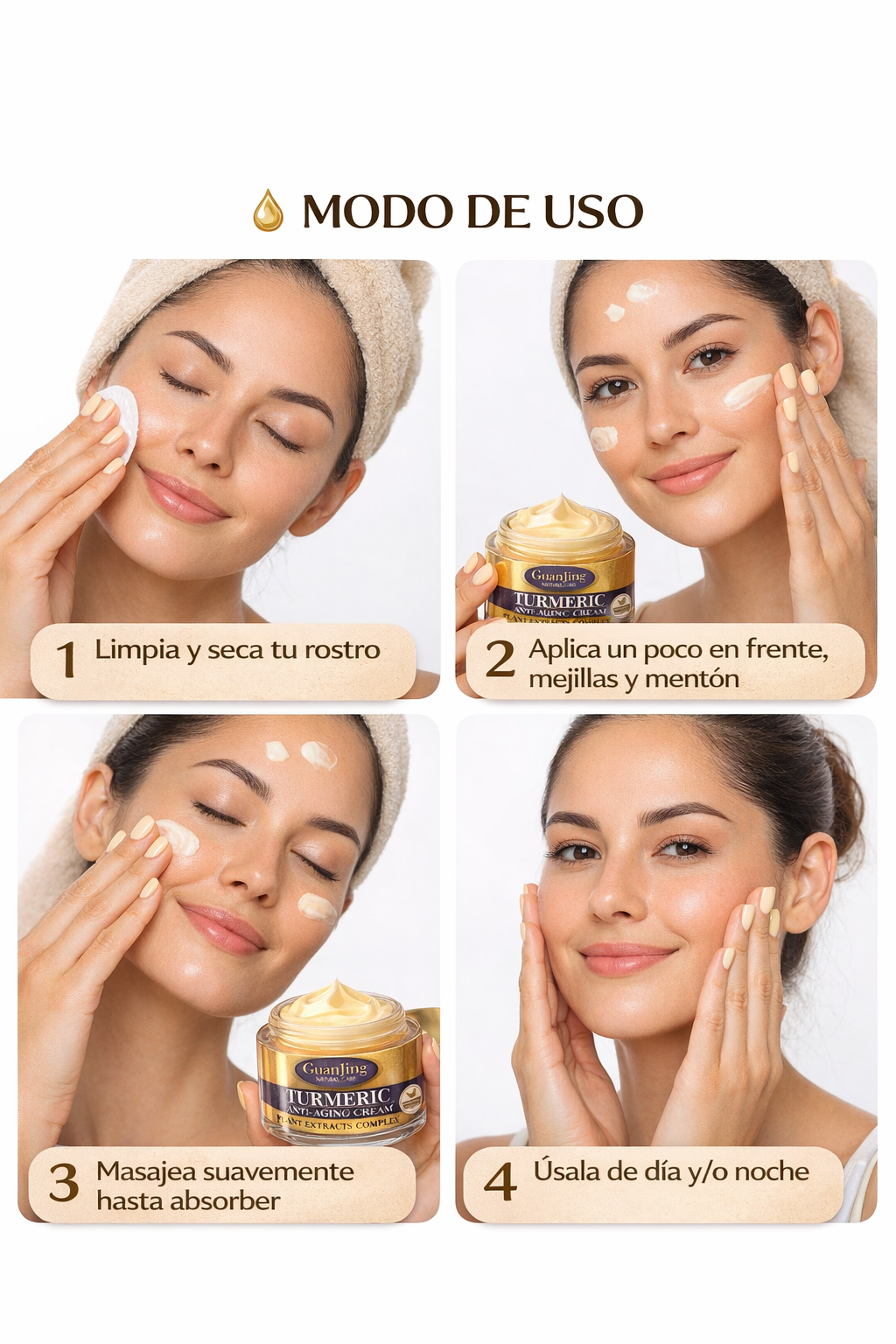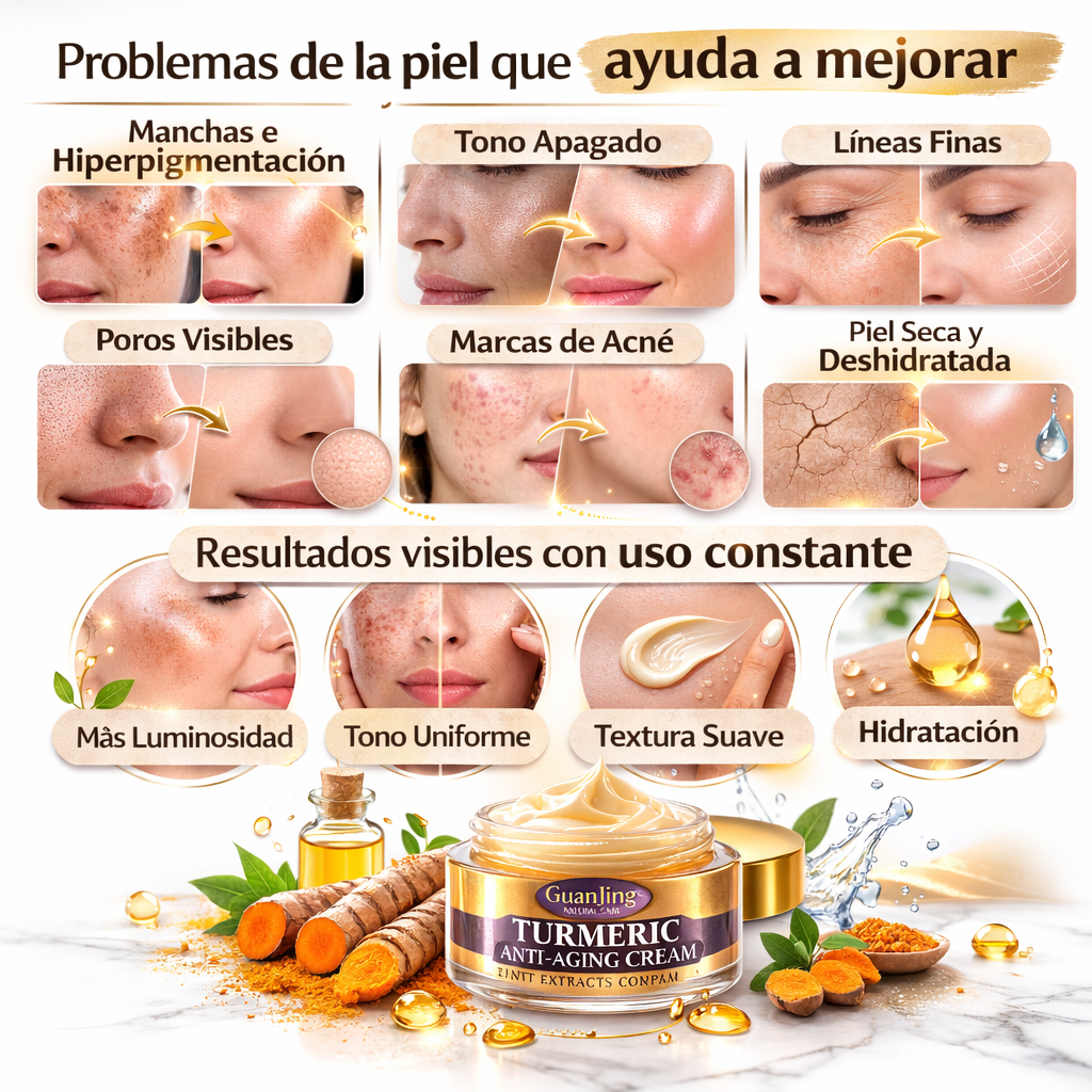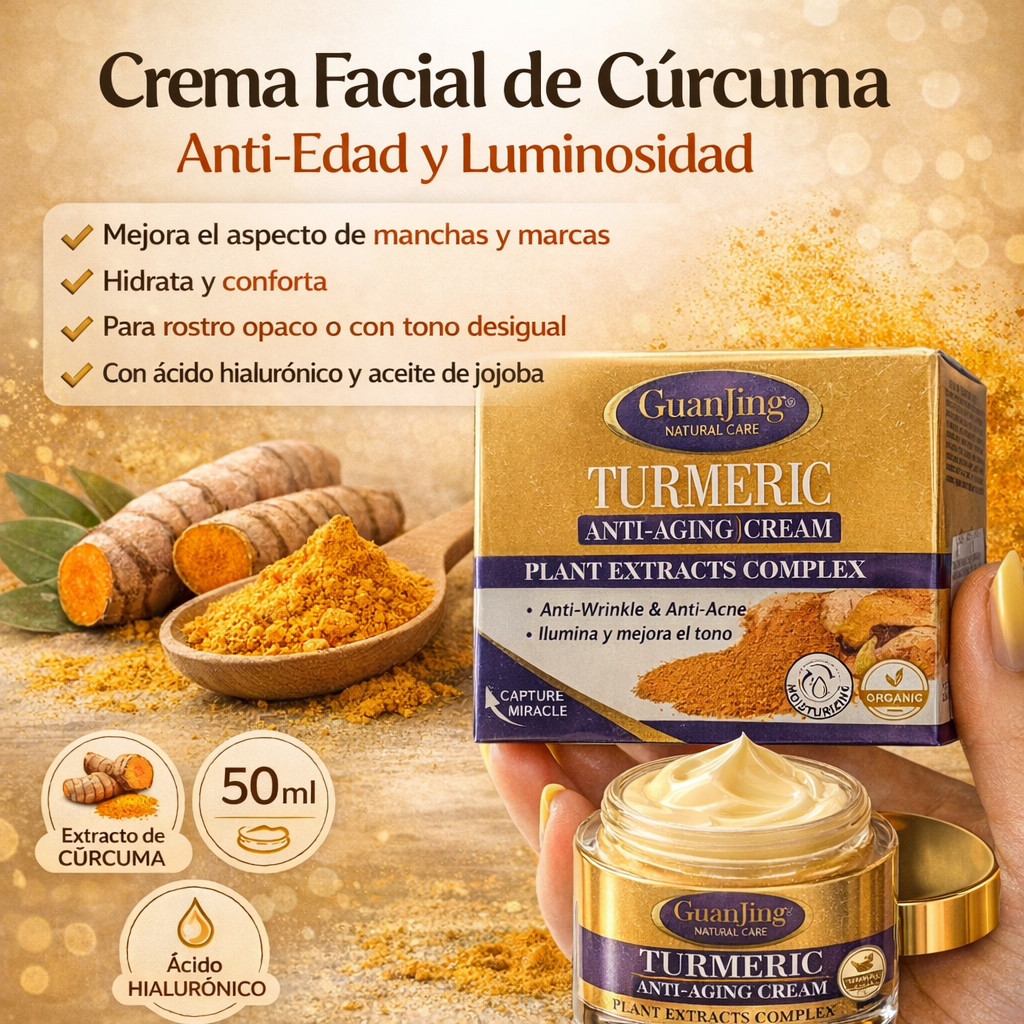 Esta Crema Facial de Cúrcuma 50 ml está pensada para acompañarte en una rutina simple y constante, enfocada en hidratar, aportar luminosidad y mejorar el aspecto general de la piel. Su fórmula combina extracto de cúrcuma, ácido hialurónico y aceite de jojoba, ingredientes conocidos en el cuidado facial por su aporte a la hidratación, confort y apariencia de piel más uniforme.