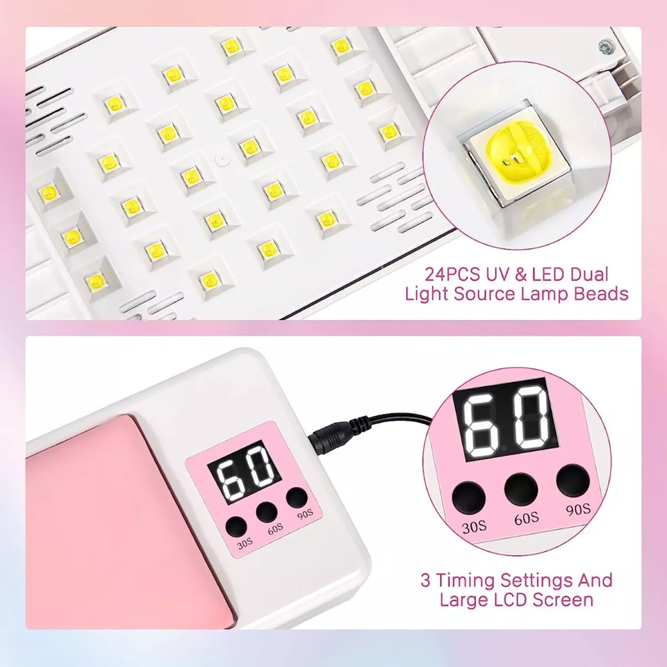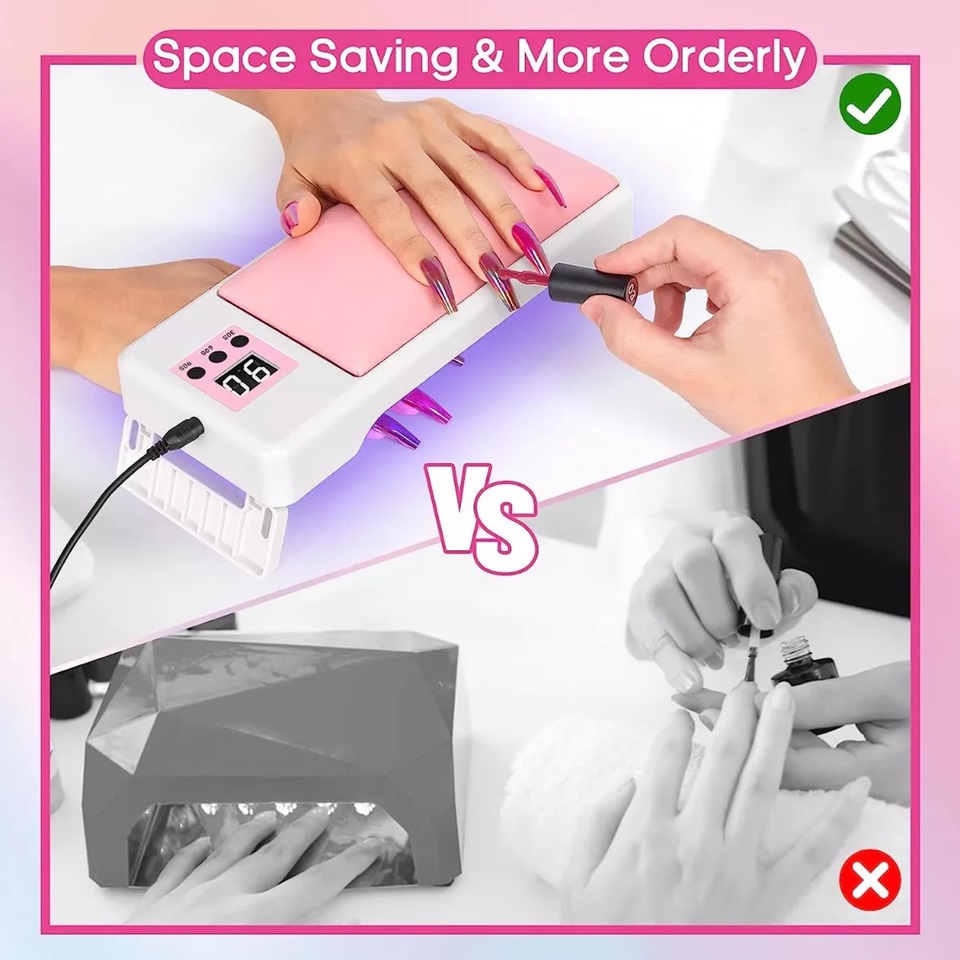 - La luz ultravioleta para uñas está equipada con un adaptador, que se puede usar siempre que el soporte de mano del cojín del reposabrazos de luz ultravioleta esté conectado a la fuente de alimentación; El soporte inferior del secador de uñas para gel y esmalte regular se puede plegar y ahorrar espacio para almacenar; El reposabrazos de manicura y la luz ultravioleta son dos funciones en una, lo que no solo reduce el espacio de almacenamiento, sino que también hace que el secador de uñas de gel UV LED sea más fácil de usar cuando viaja sin llevar más máquinas.